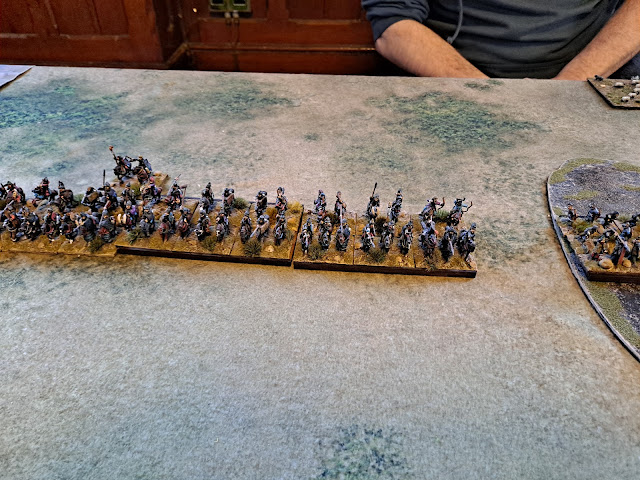 PBS saw me defending with a Depp Water secure flank - which was nice. We also had a couple of Villages on table, and nearly had 3 if it were not for a 6 rolled by Roger allowing him to remove it. Whilst Roger's army is mainly cavalry he was not unhappy with some terrain in which his slightly vulnerable infantry could operate in - especially as he would have more terrain capable infantry than I would.